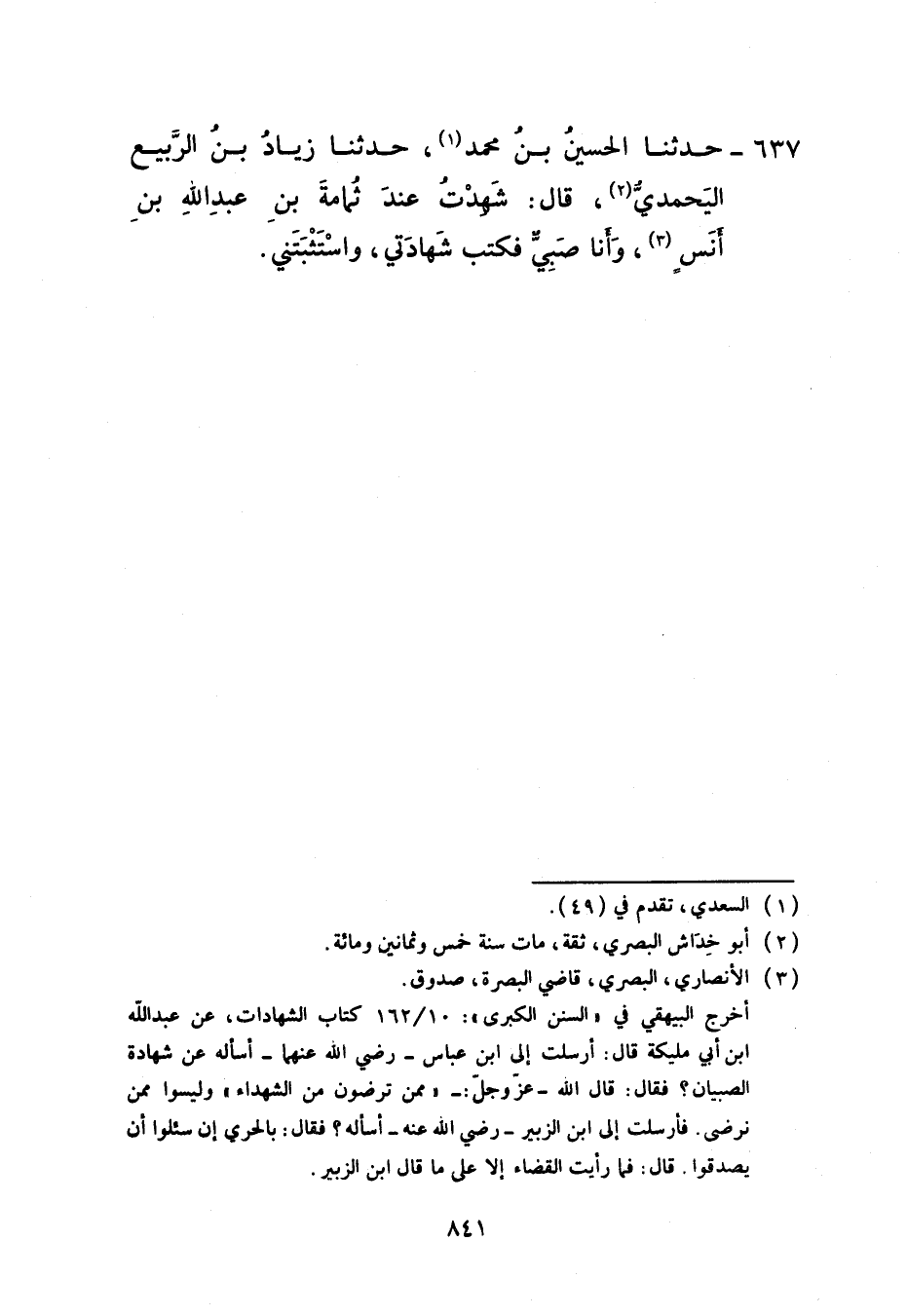 637 - حَدَّثَنَا الْحُسَيْنُ بْنُ مُحَمَّدٍ، حَدَّثَنَا زِيَادُ بْنُ الرَّبِيعِ الْيُحْمَدِيُّ، قَالَ: §شَهِدْتُ عِنْدَ ثُمَامَةَ بْنِ عَبْدِ اللَّهِ بْنِ أَنَسٍ وَأَنَا صَبِيُّ، فَكَتَبَ شَهَادَتِي وَاسْتَثْبَتَنِي