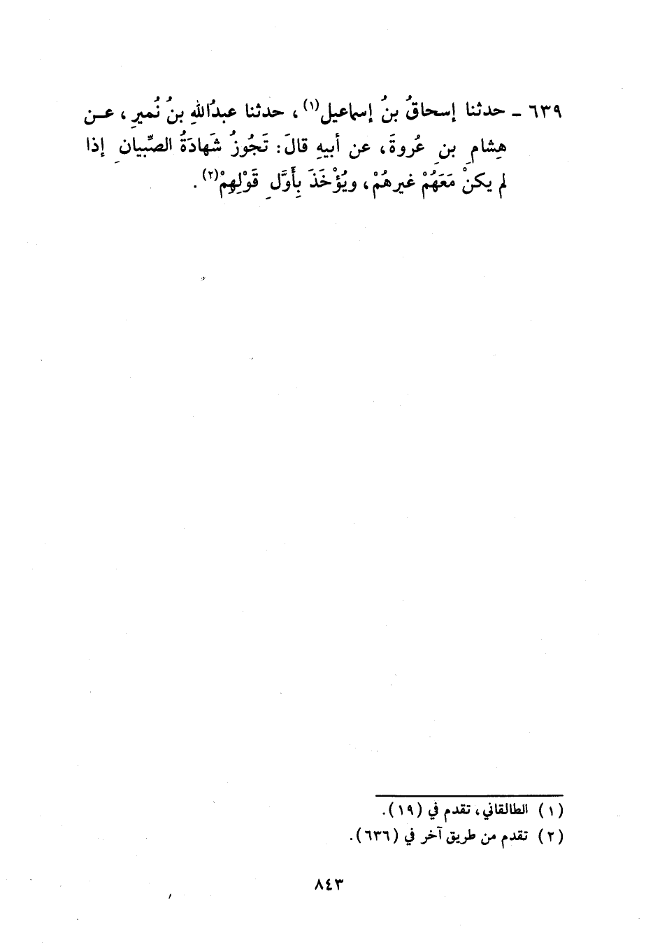 639 - حَدَّثَنَا إِسْحَاقُ بْنُ إِسْمَاعِيلَ، حَدَّثَنَا عَبْدُ اللَّهِ بْنُ نُمَيْرٍ، عَنْ هِشَامِ بْنِ عُرْوَةَ، عَنْ أَبِيهِ، قَالَ: §تَجُوزُ شَهَادَةُ الصِّبْيَانِ إِذَا لَمْ يَكُنْ مَعَهُمْ غَيْرُهُمْ وَيُؤْخَذُ بِأَوَّلِ قَوْلِهِمْ