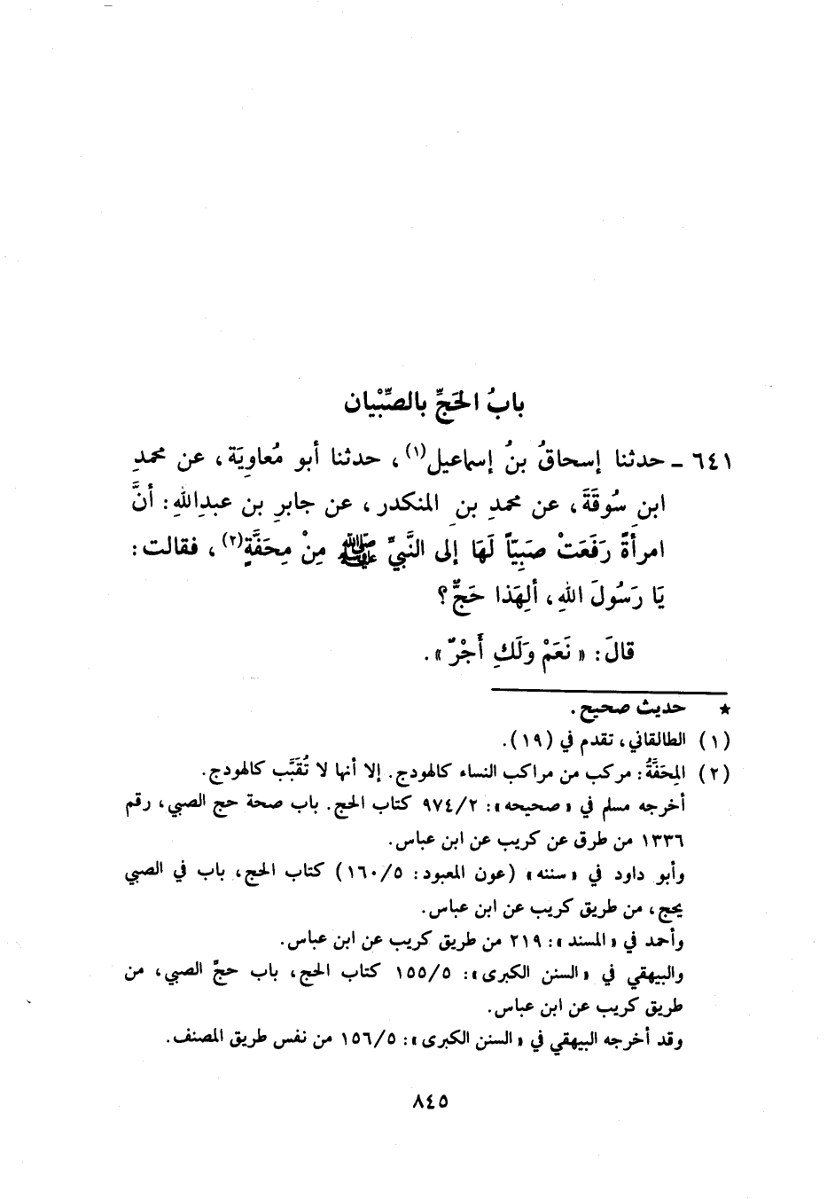 641 - حَدَّثَنَا إِسْحَاقُ بْنُ إِسْمَاعِيلَ، حَدَّثَنَا أَبُو مُعَاوِيَةَ، عَنْ مُحَمَّدِ بْنِ سُوقَةَ، عَنْ مُحَمَّدِ بْنِ الْمُنْكَدِرِ، عَنْ جَابِرِ بْنِ عَبْدِ اللَّهِ، أَنَّ امْرَأَةً رَفَعَتْ صَبِيًّا لَهَا إِلَى النَّبِيِّ صَلَّى اللهُ عَلَيْهِ وَسَلَّمَ مِنْ مِحَفَّةٍ فَقَالَتْ: يَا رَسُولَ اللَّهِ، أَلِهَذَا حَجٌّ؟ قَالَ: «نَعَمْ §وَلَكِ أَجْرٌ»