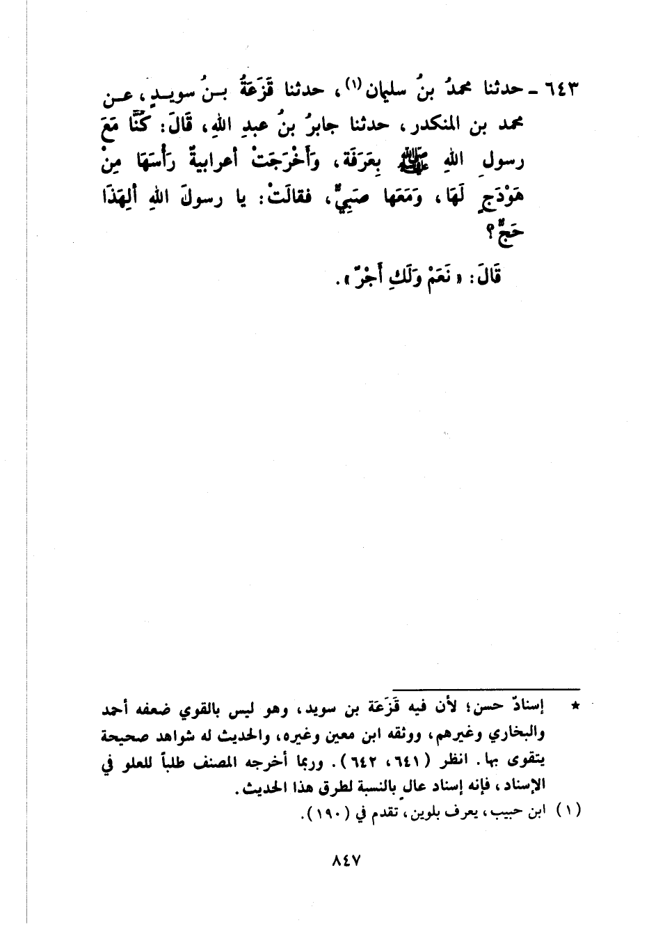 643 - حَدَّثَنَا مُحَمَّدُ بْنُ سُلَيْمَانَ، حَدَّثَنَا قَزَعَةُ بْنُ سُوَيْدٍ، عَنْ مُحَمَّدِ بْنِ الْمُنْكَدِرِ، حَدَّثَنَا جَابِرُ بْنُ عَبْدِ اللَّهِ، قَالَ: كُنَّا مَعَ رَسُولِ اللَّهِ صَلَّى اللهُ عَلَيْهِ وَسَلَّمَ بِعَرَفَةَ وَأَخْرَجَتْ أَعْرَابِيَّةٌ رَأْسَهَا مِنْ هَوْدَجٍ لَهَا وَمَعَهَا صَبِيٌّ فَقَالَتْ: يَا رَسُولَ اللَّهِ، أَلِهَذَا حَجٌّ؟ قَالَ: «نَعَمْ §وَلَكِ أَجْرٌ»