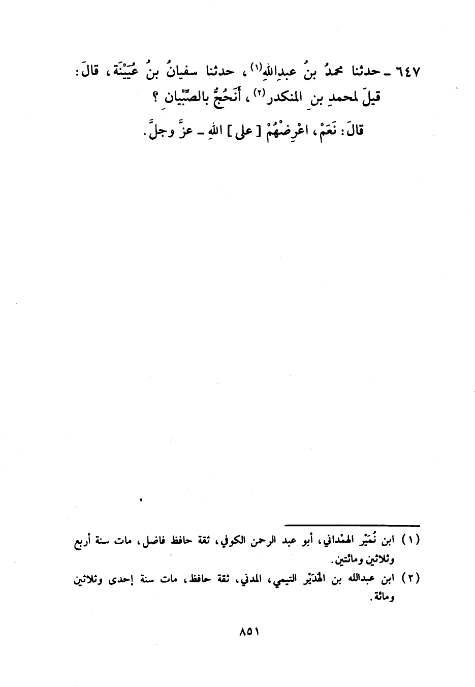 647 - حَدَّثَنَا مُحَمَّدُ بْنُ عَبْدِ اللَّهِ، حَدَّثَنَا سُفْيَانُ بْنُ عُيَيْنَةَ، قَالَ: قِيلَ لِمُحَمَّدِ بْنِ الْمُنْكَدِرِ: أَنَحُجُّ بِالصِّبْيَانِ؟ قَالَ: نَعَمْ، §اعْرِضْهُمْ عَلَى اللَّهِ عَزَّ وَجَلَّ