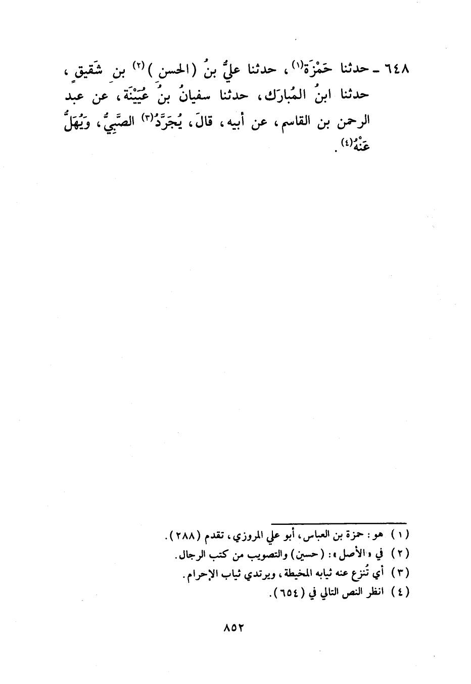 648 - حَدَّثَنَا حَمْزَةُ، حَدَّثَنَا عَلِيُّ بْنُ الْحَسَنِ بْنِ شَقِيقٍ، حَدَّثَنَا ابْنُ الْمُبَارَكِ، حَدَّثَنَا سُفْيَانُ بْنُ عُيَيْنَةَ، عَنْ عَبْدِ الرَّحْمَنِ بْنِ الْقَاسِمِ، عَنْ أَبِيهِ، قَالَ: «§يُجَرَّدُ الصَّبِيُّ وَيُهَلُّ عَنْهُ»