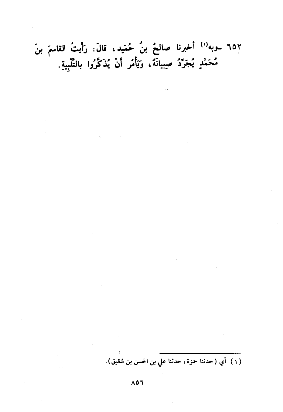 652 - وَبِهِ أَخْبَرَنَا صَالِحُ بْنُ حُمَيْدٍ، قَالَ: رَأَيْتُ الْقَاسِمَ بْنَ مُحَمَّدٍ §يُجَرِّدُ صِبْيَانَهُ وَيَأْمُرُ أَنْ يُذَكُّرُوا بِالتَّلْبِيَةِ