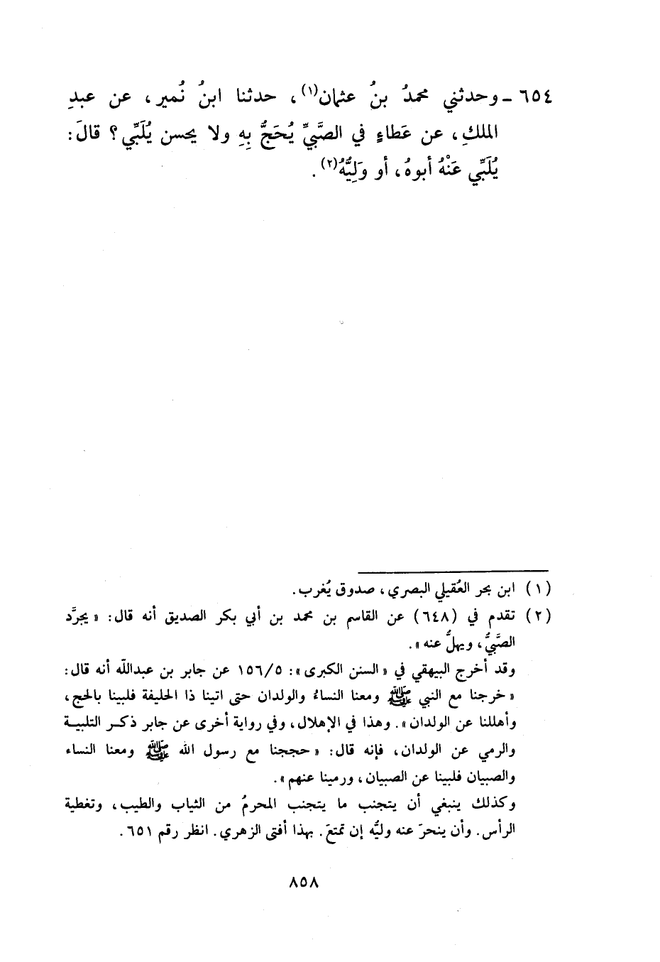 654 - وَحَدَّثَنِي مُحَمَّدُ بْنُ عُثْمَانَ، حَدَّثَنَا ابْنُ نُمَيْرٍ، عَنْ عَبْدِ الْمَلِكِ، عَنْ عَطَاءٍ، فِي §الصَّبِيِّ يُحَجُّ بِهِ وَلَا يُحْسِنُ يُلَبِّي قَالَ: «يُلَبِّي عَنْهُ أَبُوهُ أَوْ وَلِيُّهُ»