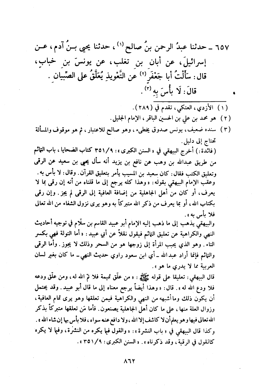 657 - حَدَّثَنَا عَبْدُ الرَّحْمَنِ بْنُ صَالِحٍ، حَدَّثَنَا يَحْيَى بْنُ آدَمَ، عَنْ إِسْرَائِيلَ، عَنْ أَبَانَ بْنِ تَغْلِبَ، عَنْ يُونُسَ بْنِ خَبَّابٍ، قَالَ: سَأَلْتُ أَبَا جَعْفَرٍ عَنِ §التَّعْوِيذِ يُعَلَّقُ عَلَى الصِّبْيَانِ قَالَ: «لَا بَأْسَ بِهِ»
