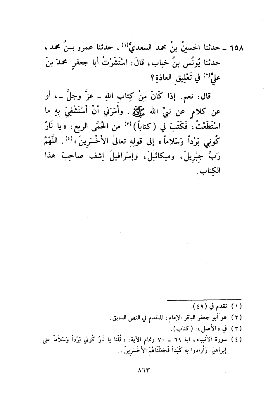 658 - حَدَّثَنَا الْحُسَيْنُ بْنُ مُحَمَّدِ السَّعْدِيُّ، حَدَّثَنَا عَمْرُو بْنُ مُحَمَّدٍ، حَدَّثَنَا يُونُسُ بْنُ خَبَّابٍ، قَالَ: اسْتَشَرْتُ أَبَا جَعْفَرٍ مُحَمَّدَ بْنَ عَلِيٍّ فِي تَعْلِيقِ الْعَاذَةِ قَالَ: نَعَمْ إِذَا كَانَ مِنْ كِتَابِ اللَّهِ عَزَّ وَجَلَّ أَوْ عَنْ كَلَامٍ عَنْ نَبِيِّ اللَّهِ صَلَّى اللهُ عَلَيْهِ وَسَلَّمَ وَأَمَرَنِي أَنْ أَسْتَشْفِيَ بِهِ مَا اسْتَطَعْتُ فَكَتَبَ لِي كِتَابًا مِنَ الْحُمَّى الرِّبْعِ {يَا نَارُ كُونِي بَرْدًا وَسَلَامًا} [الأنبياء: 69] إِلَى قَوْلِهِ تَعَالَى {الْأَخْسَرِينَ} [الأنبياء: 70] اللَّهُمَّ رَبَّ جِبْرِيلَ وَمِيكَائِيلَ وَإِسْرَافِيلَ §اشْفِ صَاحِبَ هَذَا الْكِتَابِ