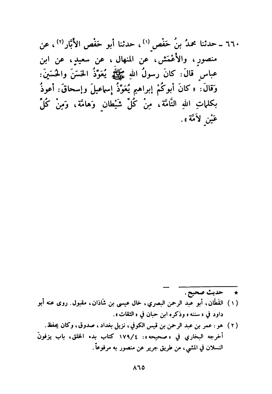 660 - حَدَّثَنَا مُحَمَّدُ بْنُ حَفْصٍ، حَدَّثَنَا أَبُو حَفْصٍ الْأَبَّارُ، عَنْ مَنْصُورٍ، وَالْأَعْمَشِ، عَنِ الْمِنْهَالِ، عَنْ سَعِيدٍ، عَنِ ابْنِ عَبَّاسٍ، قَالَ: كَانَ رَسُولُ اللَّهِ صَلَّى اللهُ عَلَيْهِ وَسَلَّمَ يُعَوِّذُ الْحَسَنَ وَالْحُسَيْنَ وَقَالَ: " كَانَ أَبُوكُمْ إِبْرَاهِيمُ يُعَوِّذُ إِسْمَاعِيلَ وَإِسْحَاقَ: §أَعُوذُ بِكَلِمَاتِ اللَّهِ التَّامَّةِ مِنْ كُلِّ شَيْطَانٍ وَهَامَّةٍ وَمِنْ كُلِّ عَيْنٍ لَامَّةٍ "