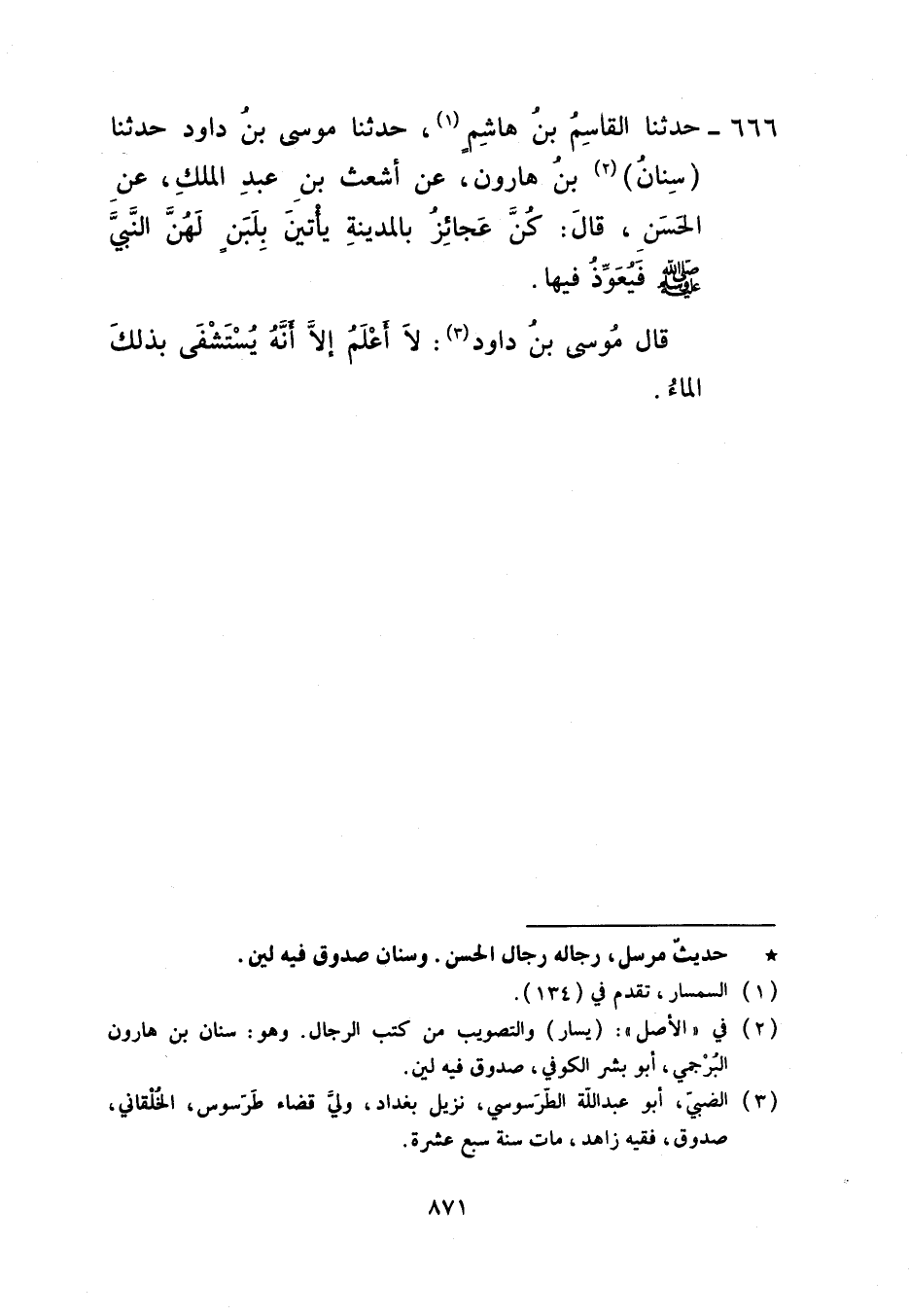 666 - حَدَّثَنَا الْقَاسِمُ بْنُ هَاشِمٍ، حَدَّثَنَا مُوسَى بْنُ دَاوُدَ، حَدَّثَنَا سِنَانُ بْنُ هَارُونَ، عَنْ أَشْعَثَ بْنِ عَبْدِ الْمَلِكِ، عَنِ الْحَسَنِ، قَالَ: كُنَّ عَجَائِزُ بِالْمَدِينَةِ §يَأْتِينَ بِلَبَنٍ لَهُنَّ النَّبِيَّ صَلَّى اللهُ عَلَيْهِ وَسَلَّمَ فَيُعَوِّذُ فِيهَا قَالَ مُوسَى بْنُ دَاوُدَ: لَا أَعْلَمُ إِلَّا أَنَّهُ يُسْتَشْفَى بِذَلِكَ الْمَاءِ