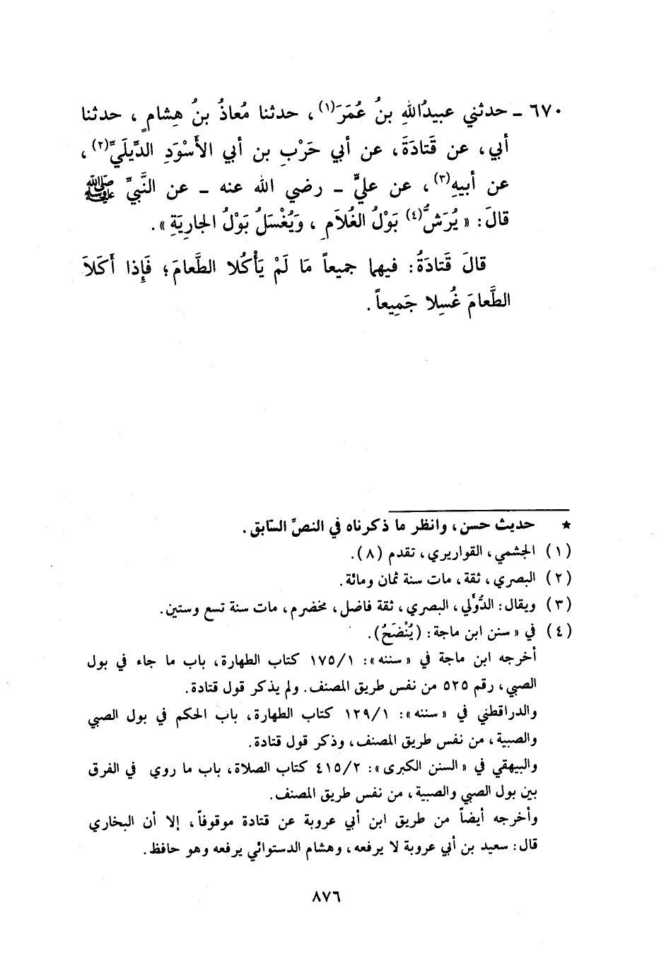 670 - حَدَّثَنِي عُبَيْدُ اللَّهِ بْنُ عُمَرَ، حَدَّثَنَا مُعَاذُ بْنُ هِشَامٍ، حَدَّثَنَا أَبِي، عَنْ قَتَادَةَ، عَنْ أَبِي حَرْبِ بْنِ أَبِي الْأَسْوَدِ الدِّيلِيِّ، عَنْ أَبِيهِ، عَنْ عَلِيٍّ، رَضِيَ اللَّهُ عَنْهُ، عَنِ النَّبِيِّ صَلَّى اللهُ عَلَيْهِ وَسَلَّمَ قَالَ: «§يُرَشُّ بَوْلُ الْغُلَامِ وَيُغْسَلُ بَوْلُ الْجَارِيَةِ» قَالَ قَتَادَةُ فِيهِمَا جَمِيعًا: مَا لَمْ يَأْكُلَا الطَّعَامَ فَإِذَا أَكَلَا الطَّعَامَ غُسِلَا جَمِيعًا