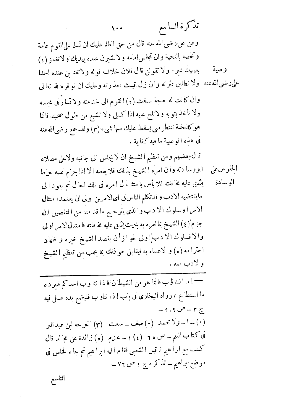 وعن علي رضي الله عنه قال: من حق العالم عليك أن تسلم على القوم عامة وتخصه بالتحية وأن تجلس أمامه ولا تشيرن عنده بيديك ولا تغمز بعينيك غيره، ولا تقولن: قال فلان خلاف قوله، ولا تغتابن عنده أحدًا، ولا تطلبن عثرته وإن زل قبلت معذرته، وعليك أن توقره لله تعالى، وإن كانت له حاجة سبقت القوم إلى خدمته ولا تسارّ في مجلسه ولا تأخذ بثوبه ولا تلح عليه إذا كسل، ولا تشبع من طول صحبته فإنما هو كالنخلة تنتظر متى يسقط عليك منها شيء، ولقد جمع رضي الله عنه في هذه الوصية ما فيه كفاية.