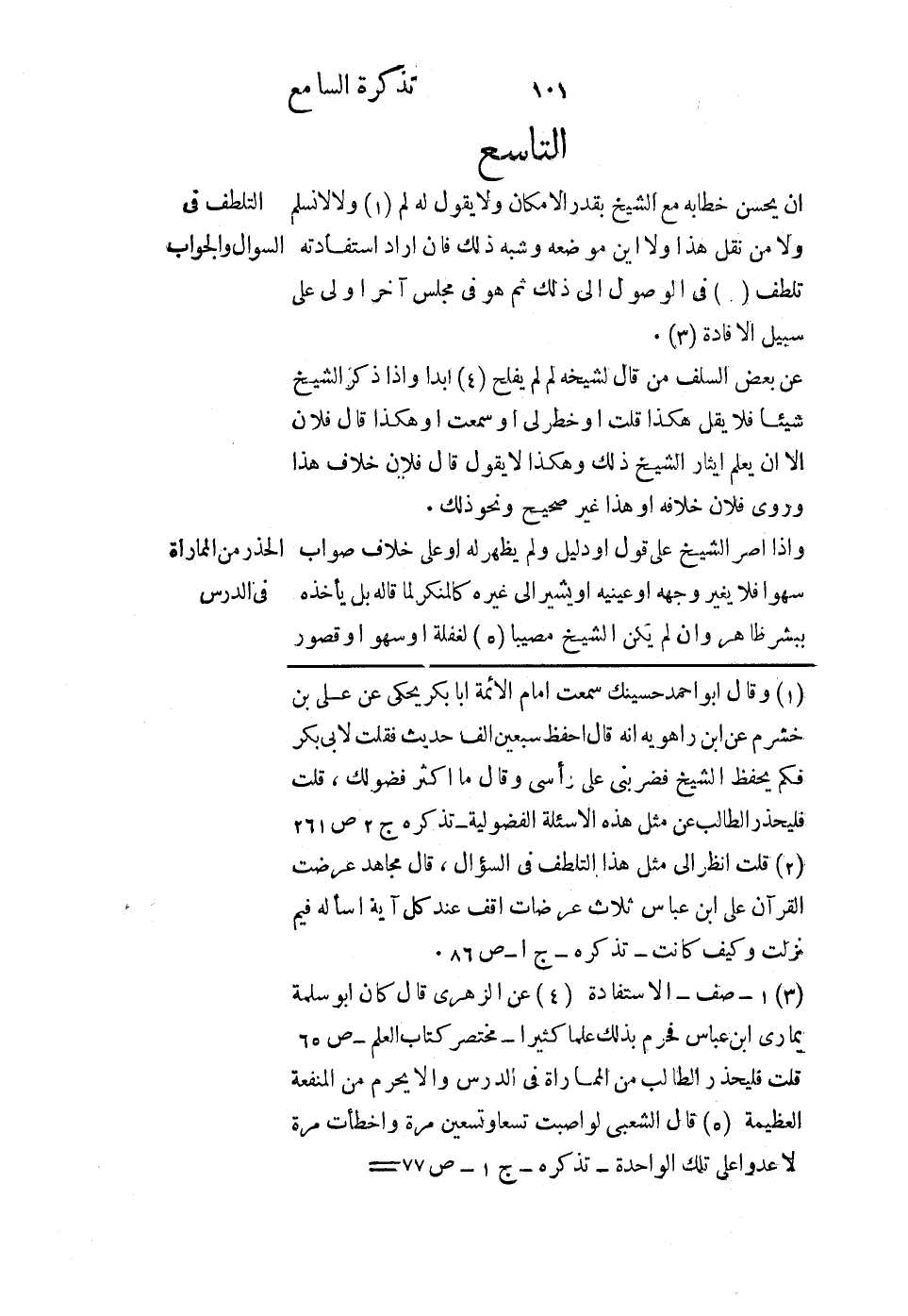 أن يحسن خطابه مع الشيخ بقدر الإمكان ولا يقول له لم، ولا لا نسلم، ولا من نقل هذا، ولا أين موضعه وشبه ذلك فإن أراد استفادته تلطف في الوصول إلى ذلك، ثم هو في مجلس آخر أولى على سبيل الإفادة.