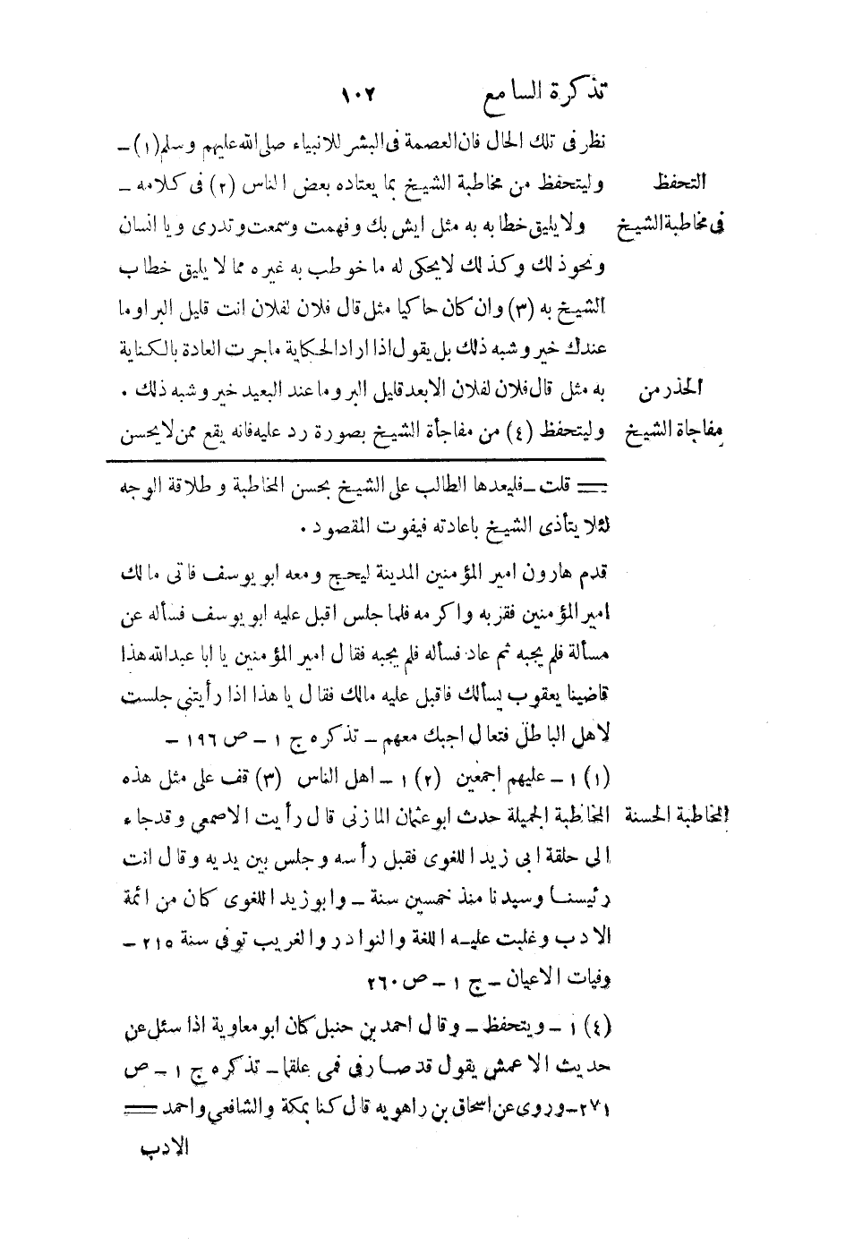 نظر في تلك الحال فإن العصمة في البشر للأنبياء صلى الله عليهم وسلم، وليتحفظ من مخاطبة الشيخ بما يعتاده بعض الناس في كلامه، ولا يليق خطابه به مثل: إيش بك، وفهمت، وسمعت، وتدري، ويا إنسان، ونحو ذلك، وكذلك لا يحكي له ما خوطب به غيره مما لا يليق خطاب الشيخ به، وإن كان حاكيًا مثل: قال فلان لفلان: أنت قليل البر، أو ما عندك خير وشبه ذلك، بل يقول إذا أراد الحكاية ما جرت العادة بالكناية به مثل: قال فلان لفلان الأَبْعَد قليل البر, وما عند البعيد خير وشبه ذلك. وليتحفظ من مفاجأة الشيخ بصورة رد عليه فإنه يقع ممن لا يحسن