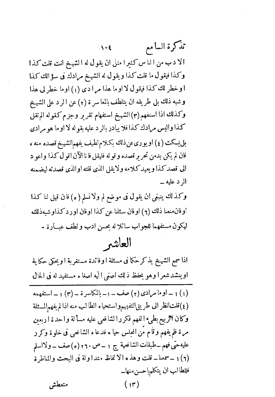 الأدب من الناس كثيرًا مثل أن يقول له الشيخ: أنت قلت كذا وكذا، فيقول: ما قلت كذا، ويقول له الشيخ: مرادك في سؤالك كذا، أو خطر لك كذا, فيقول: لا أو ما هذا مرادي، أو ما خطر لي هذا وشبه ذلك، بل طريقه أن يتلطف بالمعاسرة عن الرد على الشيخ، وكذلك إذا استفهم الشيخ استفهام تقرير وجزم كقوله: ألم تقل كذا، وأليس مرادك كذا، فلا يبادر بالرد عليه بقوله لا أو ما هو مرادي، بل يسكت أو يوري عن ذلك بكلام لطيف يفهم الشيخ قصده منه، فإن لم يكن بد من تحرير قصده وقوله، فليقل: فأنا الآن أقول كذا، وأعود إلى قصد كذا، ويعيد كلامه ولا يقل الذي قلته أو الذي قصدته ليضمنه الرد عليه.
