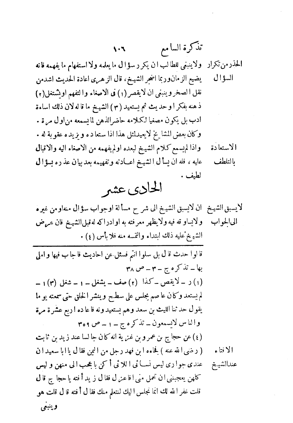 ولا ينبغي للطالب أن يكرر سؤال ما يعلمه ولا استفهام ما يفهمه؛ فإنه يضيع الزمان وربما أضجر الشيخ، قال الزهري: إعادة الحديث أشد من نقل الصخر، وينبغي أن لا يقصر في الإصغاء والتفهم أو يشتغل ذهنه بفكر أو حديث ثم يستعيد الشيخ ما قاله لأن ذلك إساءة أدب بل يكون مصغيًا لكلامه حاضر الذهن لما يسمعه من أول مرة.