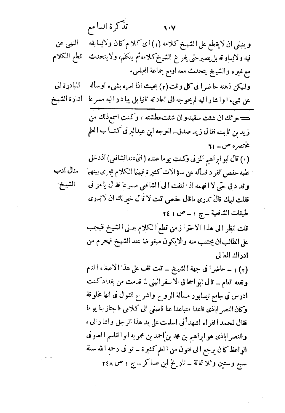 وينبغي أن لا يقطع على الشيخ كلامه؛ أي كلام كان، ولا يسابقه فيه ولا يساوقه بل يصبر حتى يفرغ الشيخ كلامه ثم يتكلم، ولا يتحدث مع غيره والشيخ يتحدث معه أو مع جماعة المجلس.