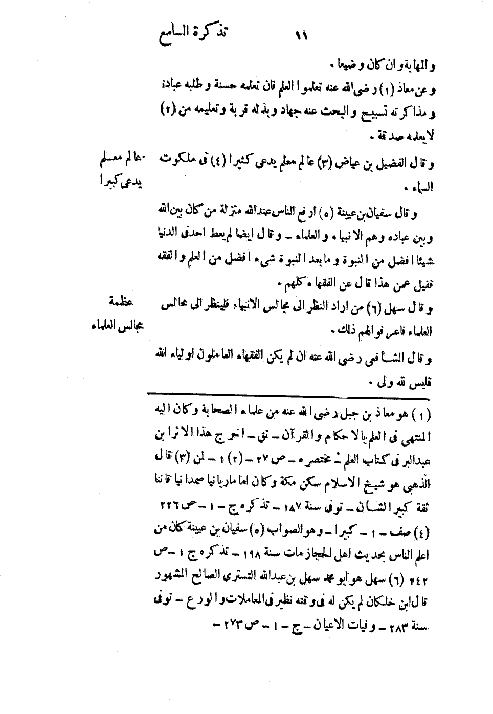 وعن معاذ رضي الله عنه: تعلموا العلم فإن تعلمه حسنة وطلبه عبادة ومذاكرته تسبيح والبحث عنه جهاد وبذله قربة وتعليمه من لا يعلمه صدقة.