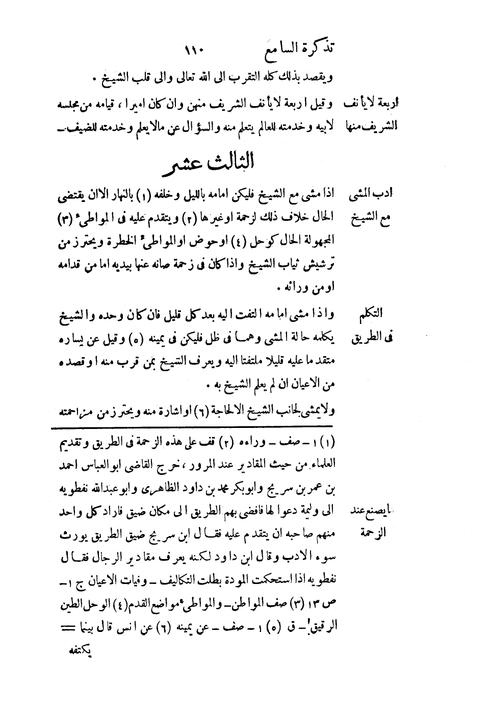 وإذا مشى أمامه التفت إليه بعد كل قليل، فإن كان وحده والشيخ يكلمه حالة المشي وهما في ظل فليكن في يمينه وقيل: عن يساره، متقدمًا عليه قليلاً ملتفتًا إليه ويُعَرِّف الشيخ بمن قرب منه أو قصده من الأعيان إن لم يعلم الشيخ به.