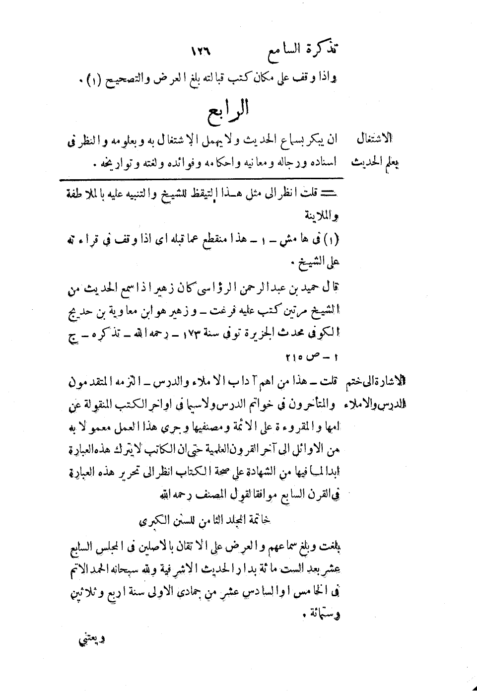أن يبكر بسماع الحديث ولا يهمل الاشتغال به وبعلومه والنظر في إسناده ورجاله ومعانيه وأحكامه وفوائده ولغته وتواريخه.