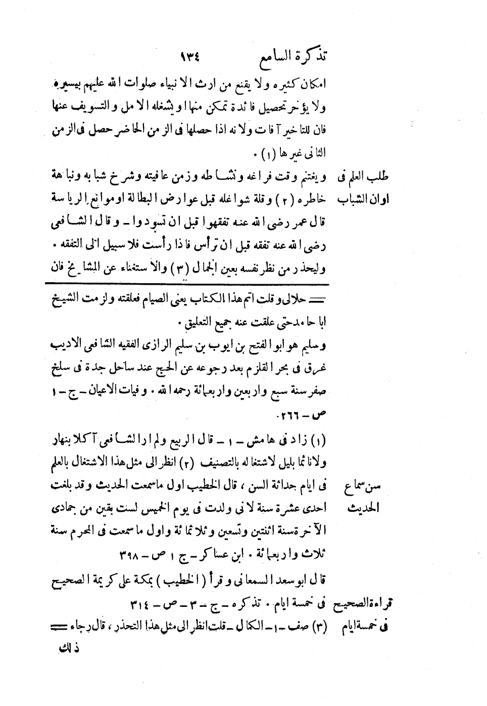 ويغتنم وقت فراغه ونشاطه وزمن عافيته وشرخ شبابه ونباهة خاطره وقلة شواغله قبل عوارض البطالة أو موانع الرياسة، قال عمر رضي الله عنه: تفقهوا قبل أن تسودوا. وقال الشافعي رضي الله عنه: تفقه قبل أن ترأس فإذا رأست فلا سبيل إلى التفقه. وليحذر من نظر نفسه بعين الجمال والاستغناء عن المشايخ فإن