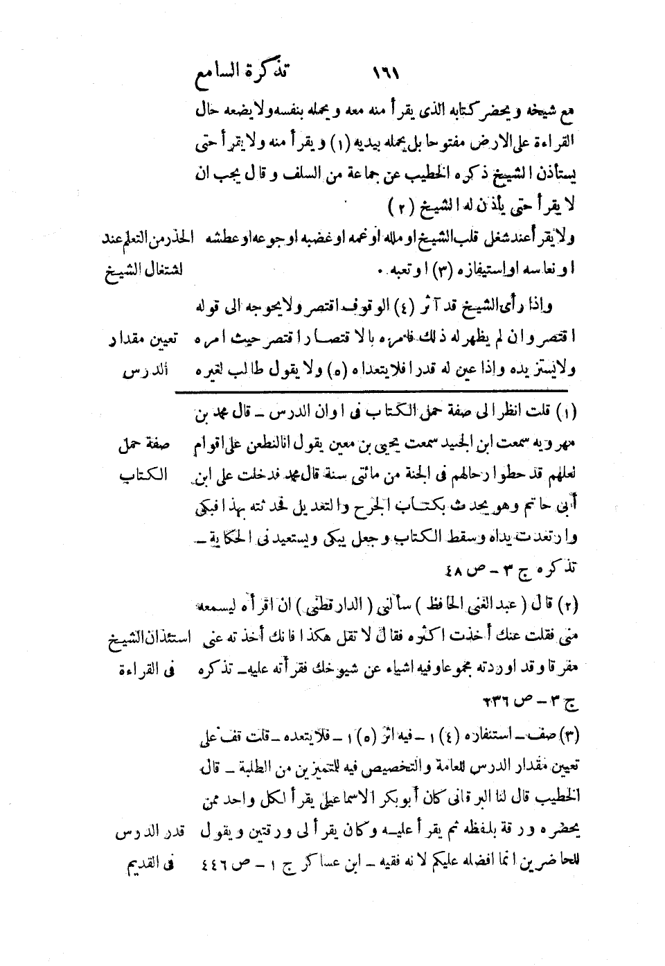 مع شيخه ويحضر كتابه الذي يقرأ منه معه ويحمله بنفسه ولا يضعه حال القراءة على الأرض مفتوحًا بل يحمله بيديه ويقرأ منه، ولا يقرأ حتى يستأذن الشيخ، ذكره الخطيب عن جماعة من السلف، وقال: يجب أن لا يقرأ حتى يأذن له الشيخ.