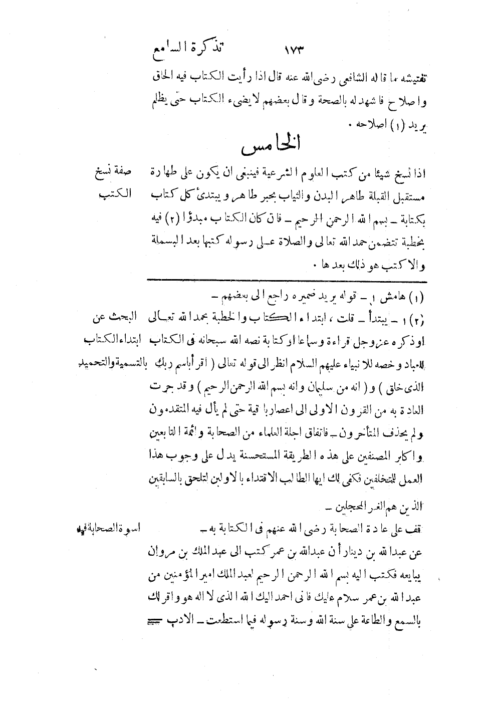 إذا نسخ شيئًا من كتب العلوم الشرعية فينبغي أن يكون على طهارة مستقبل القبلة طاهر البدن والثياب بحبر طاهر ويبتدئ كل كتاب بكتابة: بسم الله الرحمن الرحيم فإن كان الكتاب مبدوءًا فيه بخطبة تتضمن حمد الله تعالى والصلاة على رسوله - صلى الله عليه وسلم - كتبها بعد البسملة وإلا كتب هو ذلك بعدها.