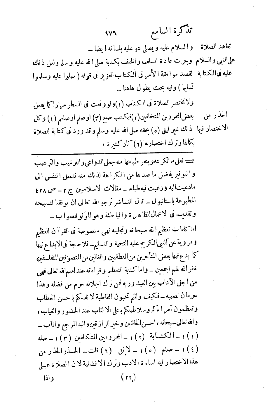 ولا تختصر الصلاة في الكتاب ولو وقعت في السطر مرارًا كما يفعل بعض المحررين المتخلفين فيكتب: صلع، أو صلم، أو صلعم، وكل ذلك غير ليق بحقه - صلى الله عليه وسلم -، وقد ورد في كتابة الصلاة بكمالها وترك اختصارها آثار كثيرة.