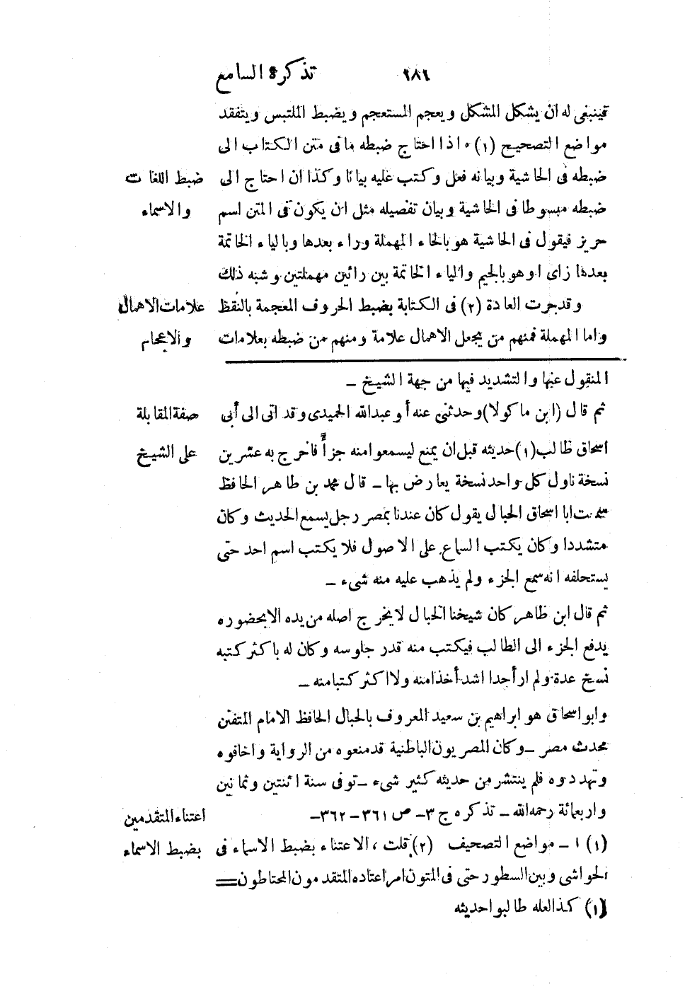 فينبغي له أن يشكل المشكل ويعجم المستعجم ويضبط الملتبس ويتفقد مواضع التصحيح إذا احتاج ضبطه ما في متن الكتاب إلى ضبطه في الحاشية وبيانه فعل وكتب عليه بيانًا وكذا إن احتاج إلى ضبطه مبسوطًا في الحاشية وبيان تفصيله مثل أن يكون في المتن اسم حريز فيقول في الحاشية هو بالحاء المهملة وراء بعدها وبالياء الخاتمة بعدها زاي أو هو بالجيم والياء الخاتمة بين رائين مهملتين وشبه ذلك.