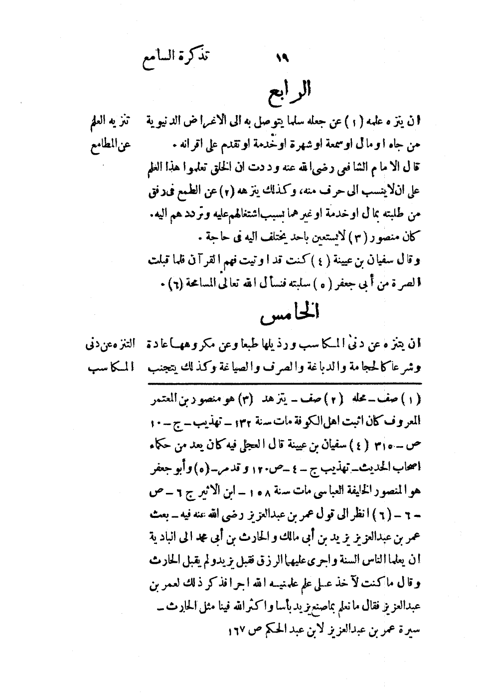 قال الإمام الشافعي رضي الله عنه: وددت أن الخلق تعلموا هذا العلم على أن لا ينسب إليَّ حرف منه، وكذلك ينزهه عن الطمع في رفق من طلبته بمال أو خدمة أو غيرهما بسبب اشتغالهم عليه وترددهم إليه، كان منصور لا يستعين بأحد يختلف إليه في حاجة.