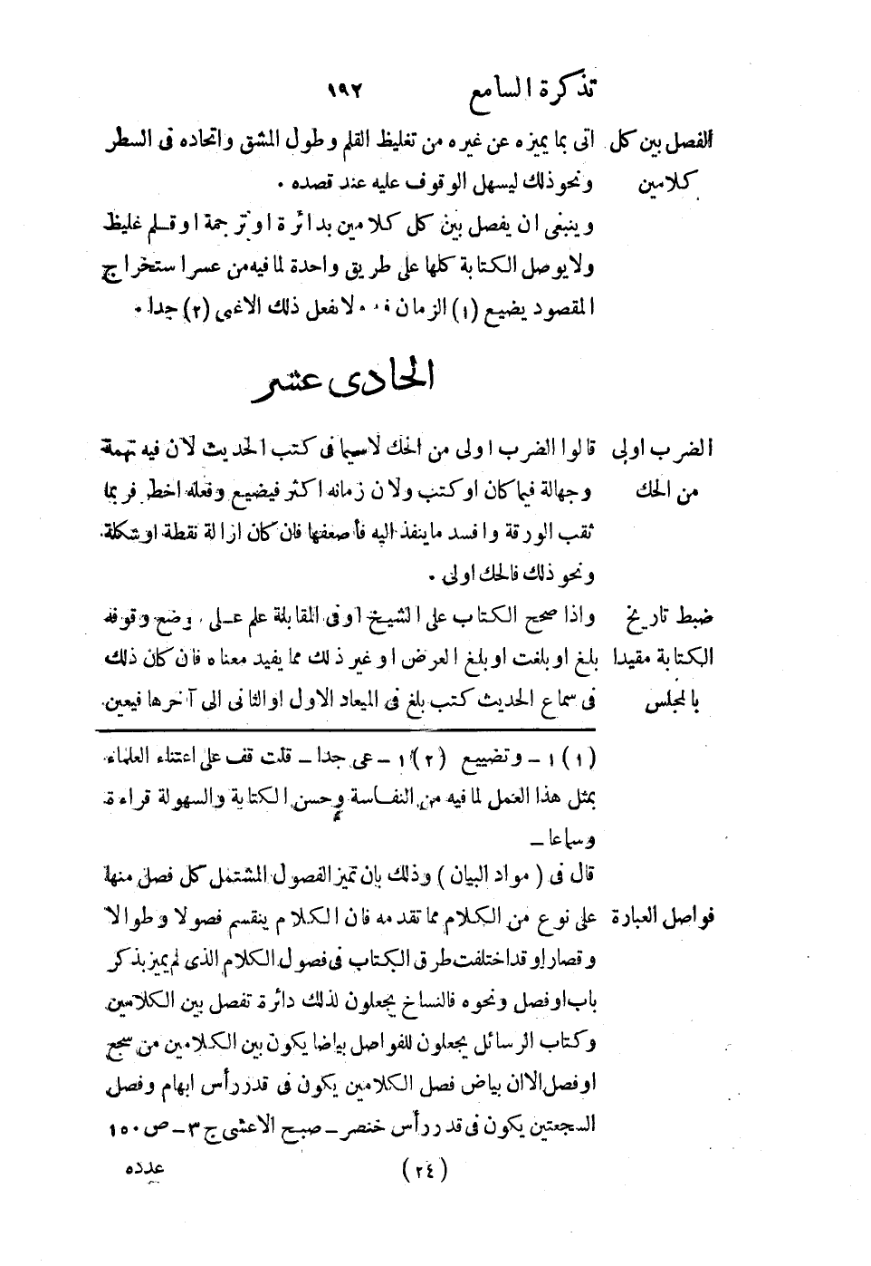 وينبغي أن يفصل بين كل كلامين بدائرة أو ترجمة أو قلم غليظ ولا يوصل الكتابة كلها على طريق واحدة لما فيه من عسر استخراج المقصود يضيع الزمان فيه ولا يفعل ذلك إلا غبي جدًا.