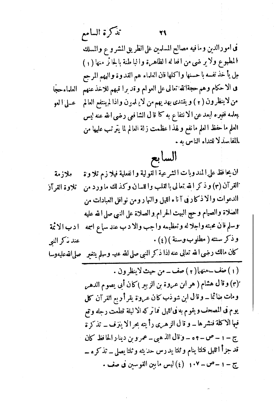 في أمور الدين وما فيه مصالح المسلمين على الطريق المشروع والمسلك المطبوع. ولا يرضى من أفعاله الظاهرة والباطنة بالجائز منها، بل يأخذ نفسه بأحسنها وأكملها فإن العلماء هم القدوة وإليهم المرجع في الأحكام وهم حجة الله تعالى على العوام وقد يراقبهم للأخذ عنهم من لا ينظرون، ويقتدي بهديهم من لا يعلمون. وإذا لم ينتفع العالم بعلمه فغيره أبعد عن الانتفاع به، كما قال الشافعي رضي الله عنه: ليس العلم ما حُفِظَ، العلم ما نَفَعَ، ولهذا عظمت زلة العالم لما يترتب عليها من المفاسد لاقتداء الناس به.
