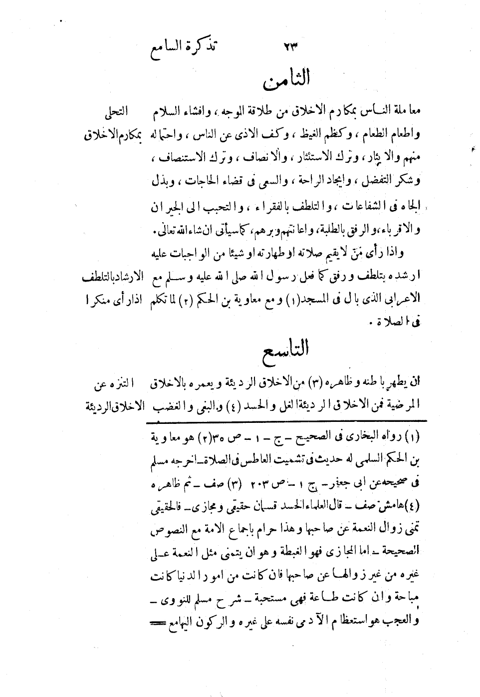 معاملة الناس بمكارم الأخلاق من طلاقة الوجه، وإفشاء السلام وإطعام الطعام، وكظم الغيظ، وكف الأذى عن الناس، واحتماله منهم والإيثار، وترك الاستئثار، والإنصاف، وترك الاستنصاف، وشكر التفضل، وإيجاد الراحة، والسعي في قضاء الحاجات، وبذل الجاه في الشفاعات، والتلطف بالفقراء، والتحبب إلى الجيران والأقرباء، والرفق بالطلبة، وإعانتهم وبرهم، كما سيأتي إن شاء الله تعالى.