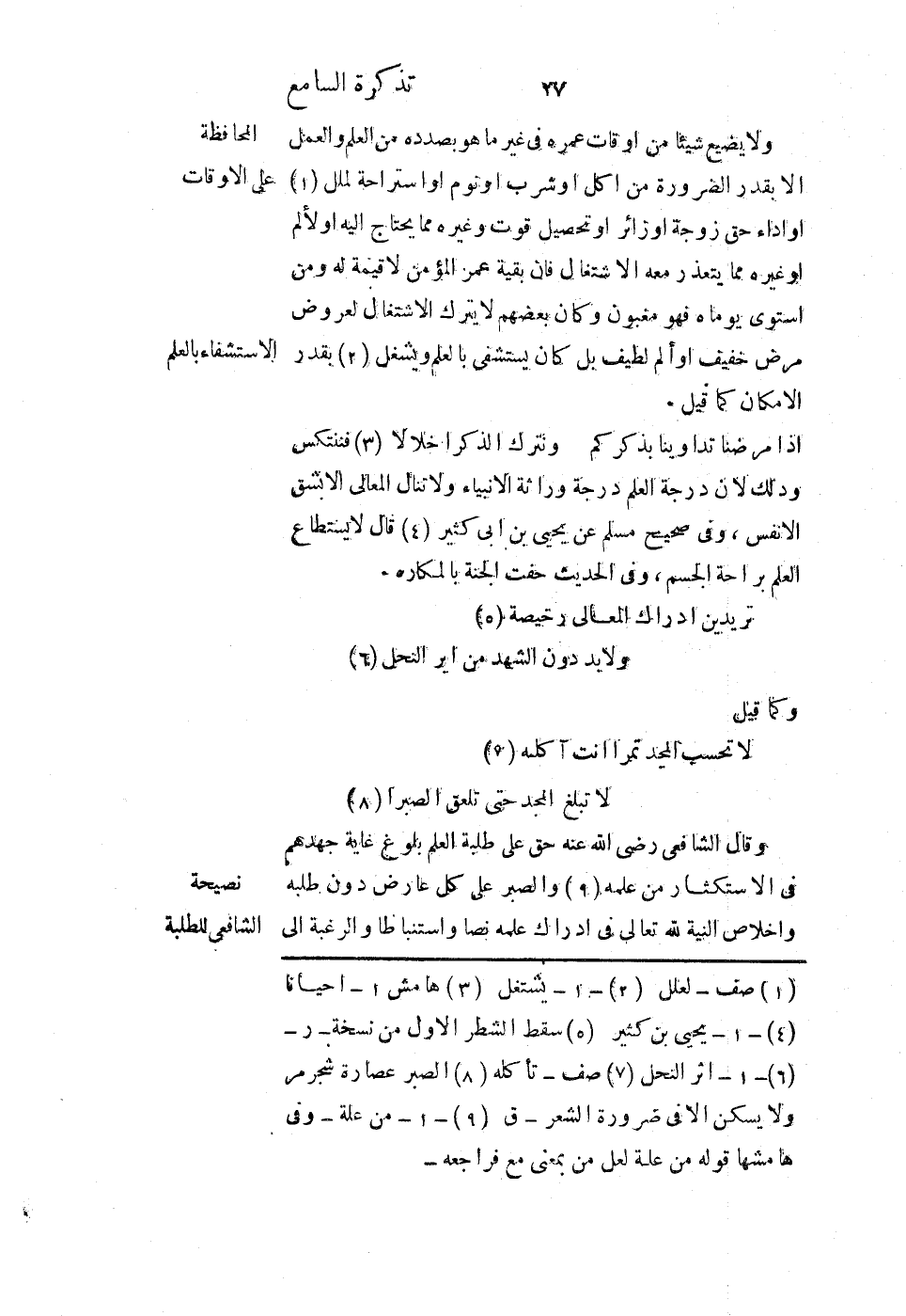 ولا يضيع شيئًا من أوقات عمره في غير ما هو بصدده من العلم والعمل إلا بقدر الضرورة من أكل أو شرب أو نوم أو استراحة لملل أو أداء حق زوجة أو زائر، أو تحصيل قوت وغيره مما يحتاج إليه أو لألم أو غيره مما يتعذر معه الاشتغال فإن بقية عمر المؤمن لا قيمة له ومن استوى يوماه فهو مغبون وكان بعضهم لا يترك الاشتغال لعروض مرض خفيف أو ألم لطيف بل كان يستشفى بالعلم ويشغل بقدر الإمكان كما قيل: