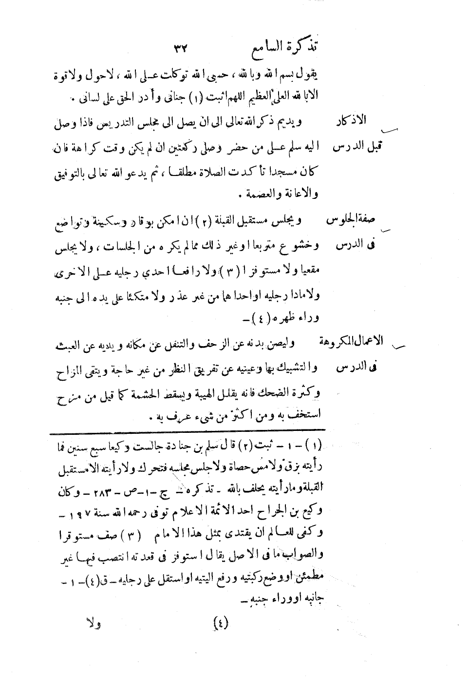 ويجلس مستقبل القبلة إن أمكن بوقار وسكينة وتواضع وخشوع متربعًا أو غير ذلك مما لم يكره من الجلسات، ولا يجلس مقعيًا ولا مستوفزًا ولا رافعًا إحدى رجليه على الأخرى، ولا مادًا رجليه أو إحداهما من غير عذر، ولا متكئًا على يده إلى جنبه وراء ظهره.
