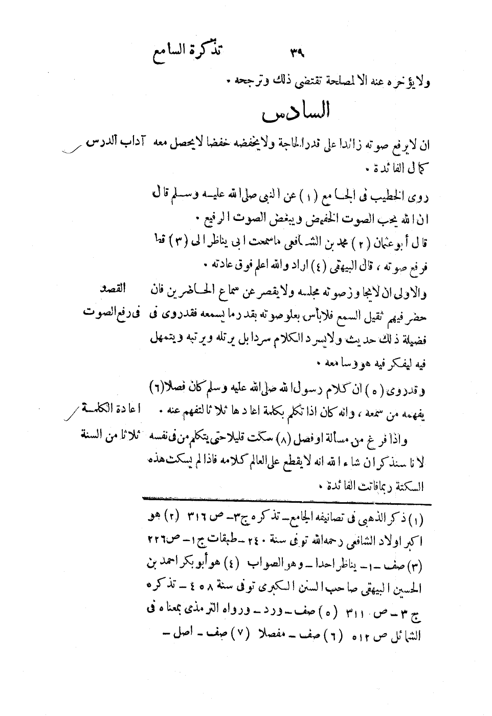والأولى أن لا يجاوز صوته مجلسه ولا يقصر عن سماع الحاضرين فإن حضر فيهم ثقيل السمع فلا بأس بعلو صوته بقدر ما يسمعه، فقد روي في فضيلة ذلك حديث, ولا يسرد الكلام سردًا بل يرتله ويرتبه ويتمهل فيه ليفكر فيه هو وسامعه.