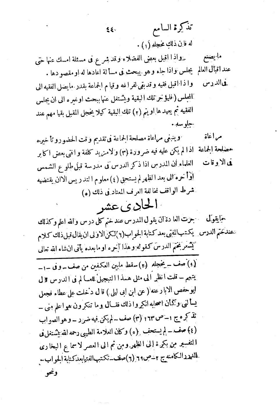وإذا أقبل فقيه وقد بقي لفراغه وقيام الجماعة بقدر ما يصل الفقيه إلى المجلس، فليؤخر تلك البقية ويشتغل عنها ببحث أو غيره إلى أن يجلس الفقيه ثم يعيدها أو يتم تلك البقية كيلا يخجل المقبل بقيامهم عند جلوسه.