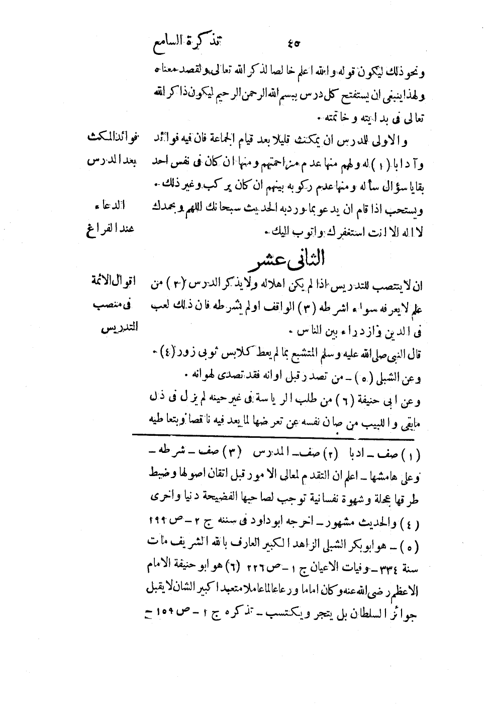 والأولى للمدرس أن يمكث قليلاً بعد قيام الجماعة فإن فيه فوائد وآدابًا وله ولهم، منها عدم مزاحمتهم، ومنها إن كان في نفس أحد بقايا سؤال سأله، ومنها عدم ركوبه بينهم إن كان يركب وغير ذلك. ويستحب إذا قام أن يدعو بما ورد به الحديث سبحانك اللهم وبحمدك لا إله إلا أنت أستغفرك وأتوب إليك.