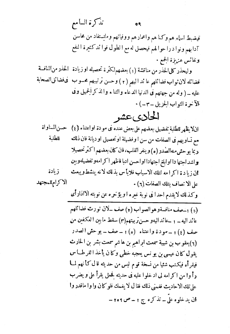 وليحذر كل الحذر من مناقشة بعضهم لكثرة تحصيله أو زيادة فضائله لأن ثواب فضائلهم عائد إليهم، وحسن ترتيبهم محسوب عليه. وله من جهتهم في الدنيا الدعاء والثناء والذكر الجميل، وفي الآخرة الثواب الجزيل.