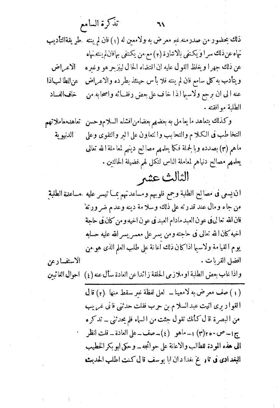 أن يسعى في مصالح الطلبة وجمع قلوبهم ومساعدتهم بما تيسر عليه من جاه ومال عند قدرته على ذلك وسلامة دينه وعدم ضرورته فإن الله تعالى في عون العبد ما دام العبد في عون أخيه، ومن كان في حاجة أخيه كان الله تعالى في حاجته، ومن يسر على معسر يسر الله عليه حسابه يوم القيامة ولاسيما إذا كان ذلك إعانة على طلب العلم الذي هو من أفضل القربات.