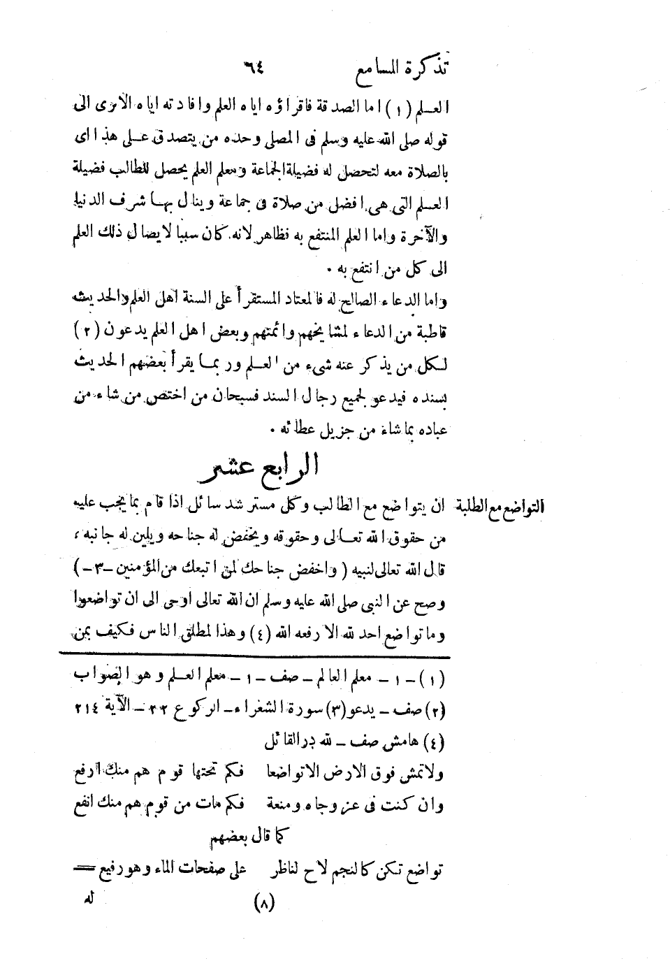 أن يتواضع مع الطالب وكل مسترشد سائل إذا قام بما يجب عليه من حقوق الله تعالى وحقوقه، ويخفض له جناحه ويلين له جانبه، قال الله تعالى لنبيه: {وَاخْفِضْ جَنَاحَكَ لِمَنِ اتَّبَعَكَ مِنَ الْمُؤْمِنِينَ} [الشعراء: ٢١٥]، وصح عن النبي - صلى الله عليه وسلم - أن الله تعالى أوحى إليَّ أن تواضعوا وما تواضع أحد لله إلا رفعه الله، وهذا لمطلق الناس فكيف بمن