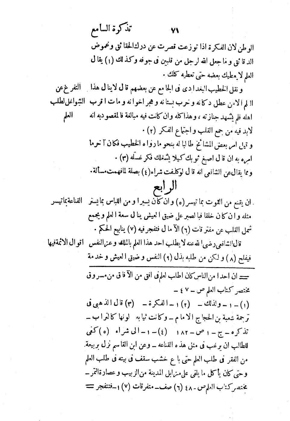 ونقل الخطيب البغدادي في الجامع عن بعضهم قال: لا ينال هذا العلم إلا من عطّل دكانه، وخرب بستانه، وهجر إخوانه، ومات أقرب أهله فلم يشهد جنازته، وهذا كله وإن كانت فيه مبالغة فالمقصود به أنه لابد فيه من جمع القلب واجتماع الفكر.