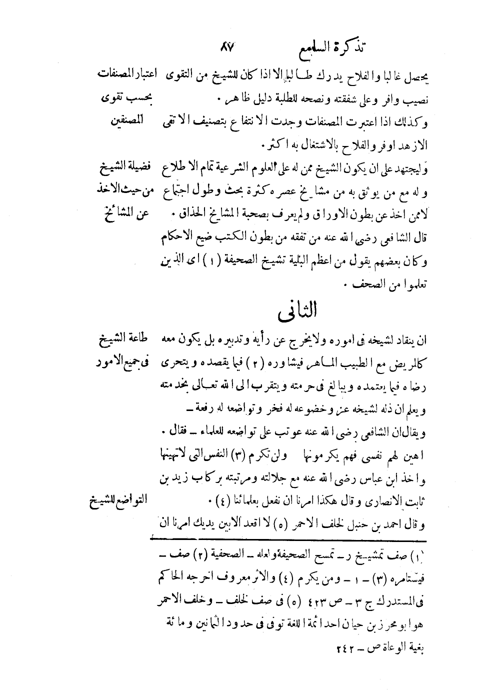 وليجتهد على أن يكون الشيخ ممن له على العلوم الشرعية تمام الإطلاع، وله مع من يوثق به من مشايخ عصره كثرة بحث وطول اجتماع، لا ممن أخذ عن بطون الأوراق ولم يعرف بصحبة المشايخ الحذاق. قال الشافعي رضي الله عنه: من تفقه من بطون الكتب ضيع الأحكام. وكان بعضهم يقول: من أعظم البلية تشيخ الصحيفة. أي الذين تعلموا من الصحف.