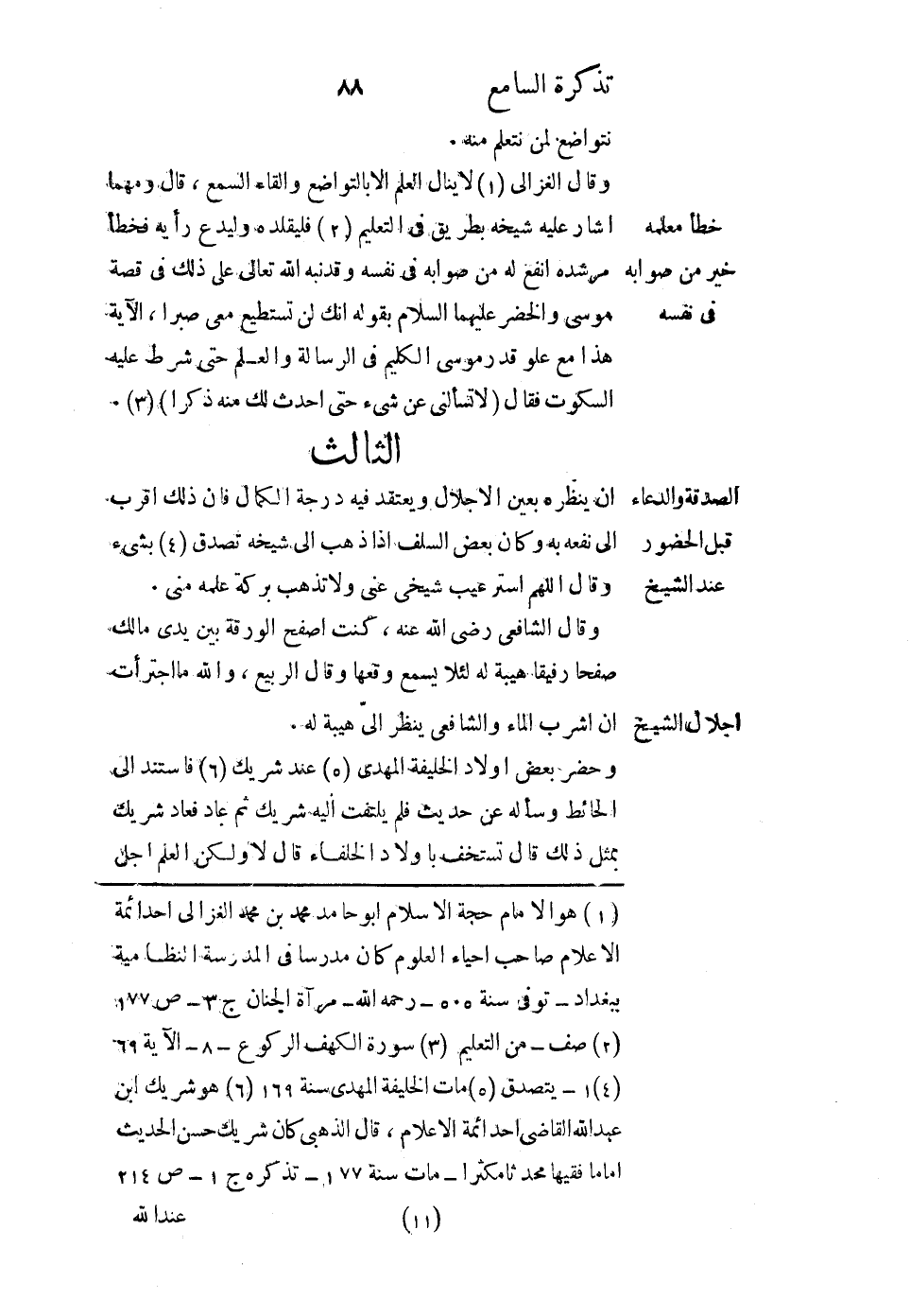 أن ينظره بعين الإجلال ويعتقد فيه درجة الكمال فإن ذلك أقرب إلى نفعه به، وكان بعض السلف إذا ذهب إلى شيخه تصدق بشيء وقال: اللهم استر عيب شيخي عني ولا تذهب بركة علمه مني.