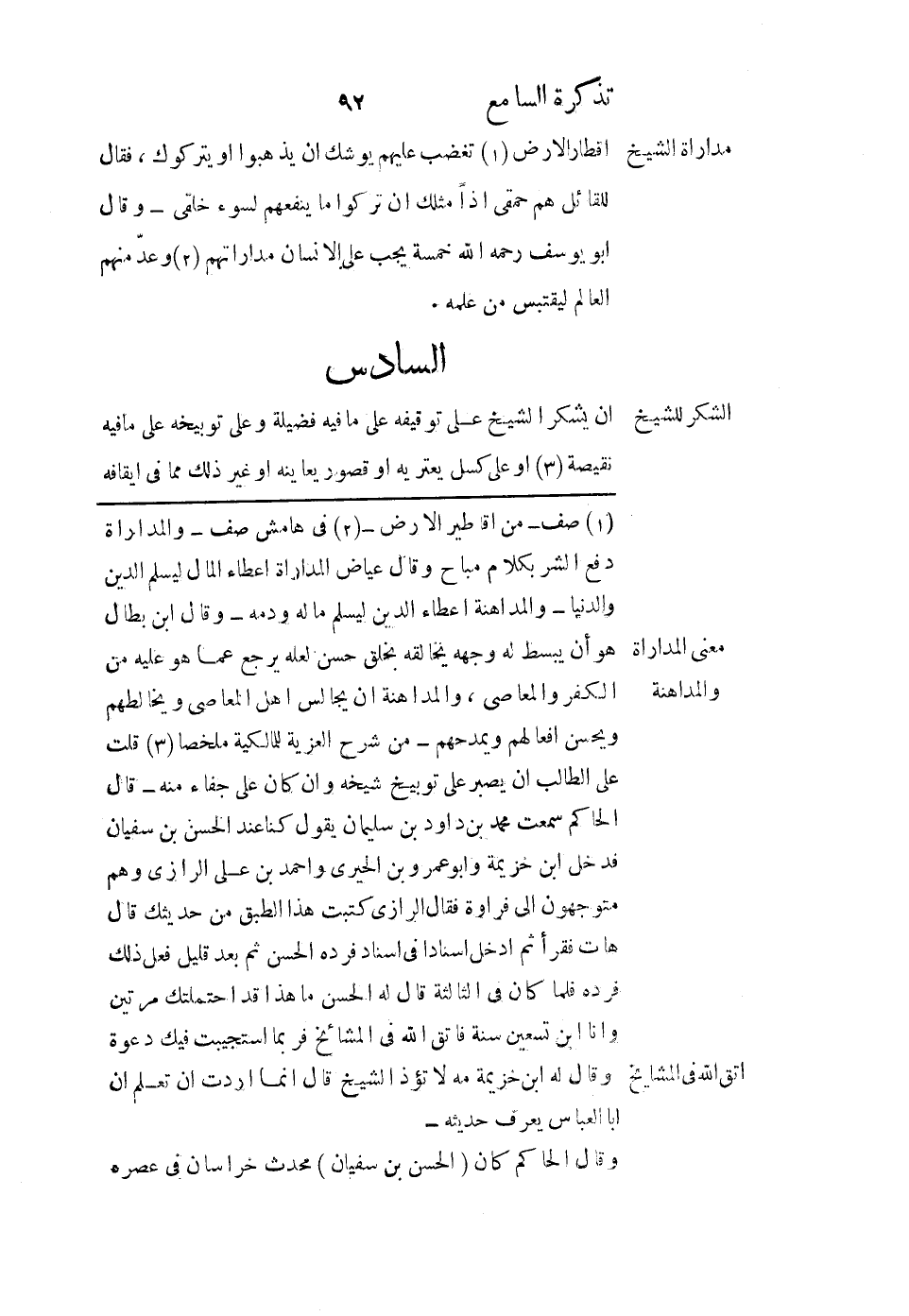أن يشكر الشيخ على توقيفه على ما فيه فضيلة، وعلى توبيخه على ما فيه نقيصة، أو على كسل يعتريه، أو قصور يعاينه أو غير ذلك مما في إيقافه