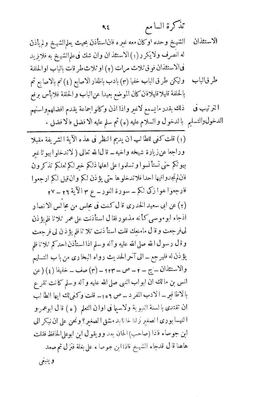 الشيخ وحده أو كان معه غيره، فإن استأذن بحيث يعلم الشيخ ولم يأذن له انصرف ولا يكرر الاستئذان، وإن شك في علم الشيخ به فلا يزيد في الاستئذان فوق ثلاث مرات أو ثلاث طرقات بالباب أو الحلقة، وليكن طرق الباب خفيًا بأدب بأظفار الأصابع، ثم بالأصابع، ثم بالحلقة قليلاً قليلاً، فإن كان الموضع بعيدًا عن الباب والحلقة فلا بأس برفع ذلك بقدر ما يسمع لا غير، وإذا أذن وكانوا جماعة يُقَدَّم أفضلهم وأسنهم بالدخول والسلام عليه، ثم سلم عليه الأفضل فالأفضل.