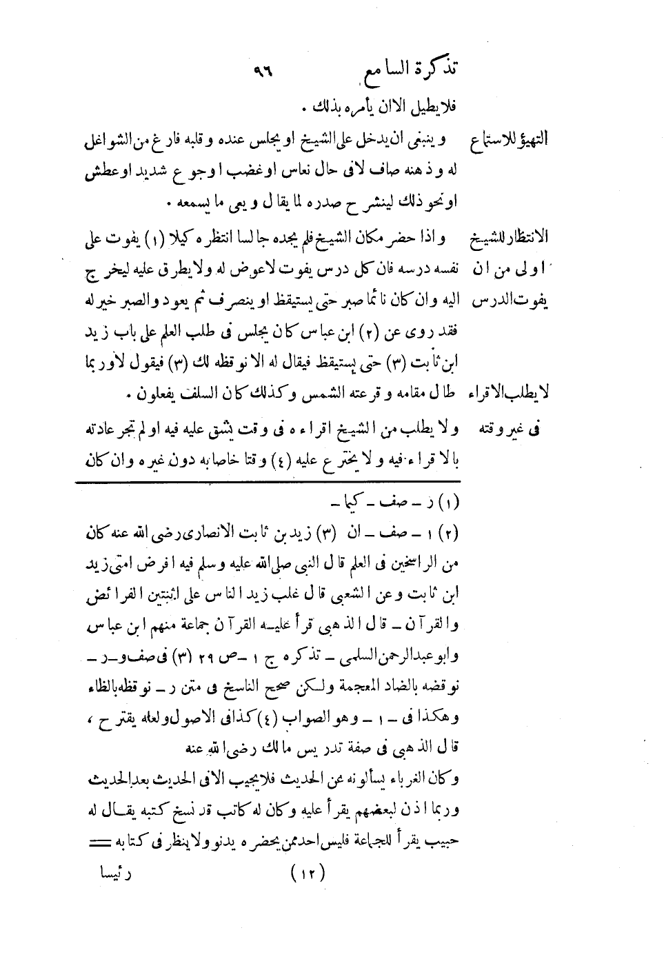 وإذا حضر مكان الشيخ فلم يجده جالسًا انتظره كيلا يفوت على نفسه درسه؛ فإن كل درس يفوت لا عوض له ولا يطرق عليه ليخرج إليه، وإن كان نائمًا صبر حتى يستيقظ أو ينصرف ثم يعود والصبر خير له، فقد روي عن ابن عباس كان يجلس في طلب العلم على باب زيد بن ثابت حتى يستيقظ فيقال له: ألا نوقظه لك؟ فيقول: لا، وربما طال مقامه وقرعته الشمس، وكذلك كان السلف يفعلون.