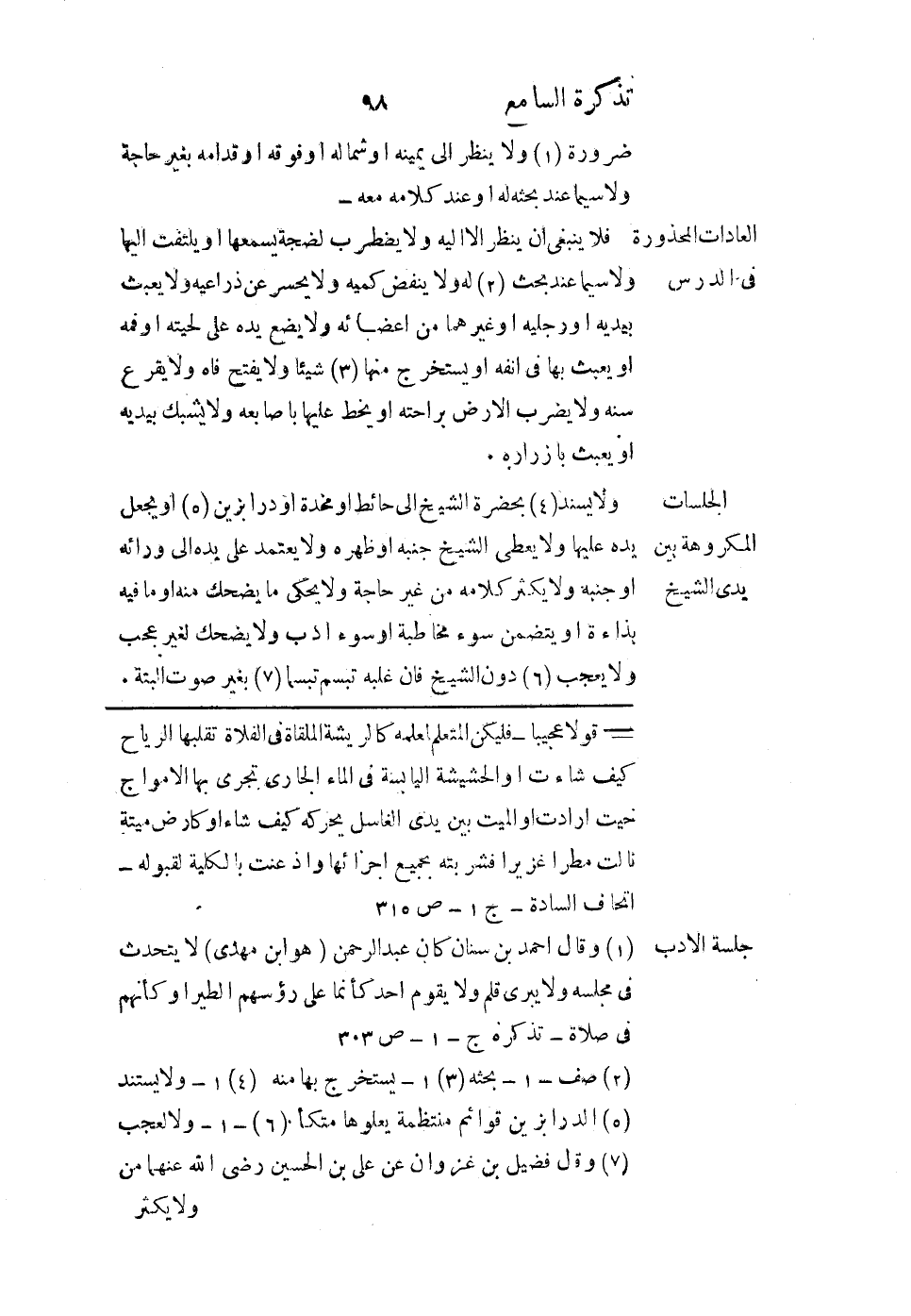 ولا يسند بحضرة الشيخ إلى حائط أو مخدة أو درابزين، أو يجعل يده عليها، ولا يعطي الشيخ جنبه أو ظهره، ولا يعتمد على يده إلى ورائه أو جنبه، ولا يكثر كلامه من غير حاجة، ولا يحكي ما يضحك منه أو ما فيه بذاءة أو يتضمن سوء مخاطبة أو سوء أدب، ولا يضحك لغير عجب، ولا يعجب دون الشيخ، فإن غلبه تبسم تبسمًا بغير صوت البتة.