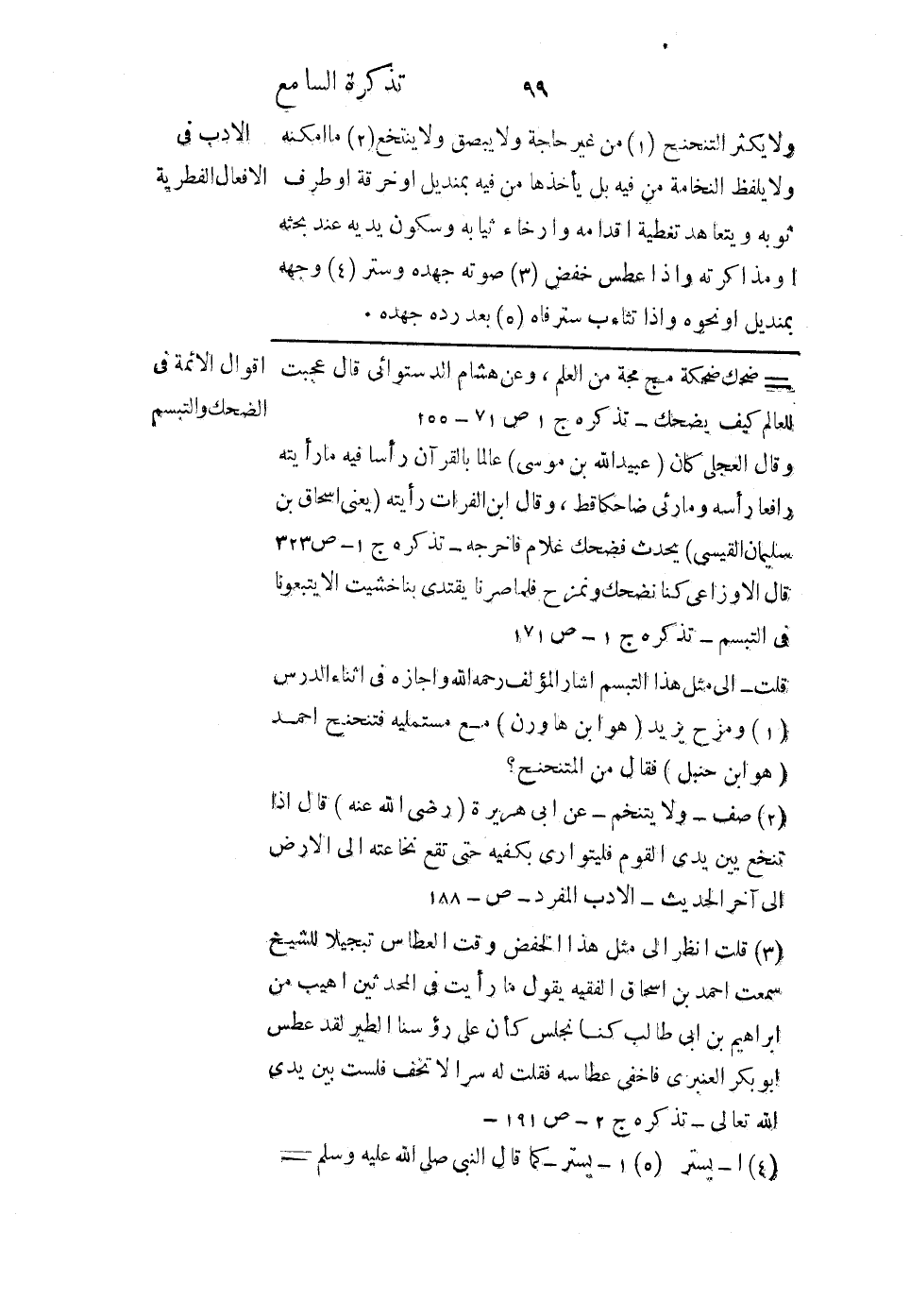 ولا يكثر التنحنح من غير حاجة ولا يبصق ولا يتنخع ما أمكنه، ولا يلفظ النخامة من فيه بل يأخذها من فيه بمنديل أو خرقة أو طرف ثوبه ويتعاهد تغطية أقدامه وإرخاء ثيابه وسكون يديه عند بحثه أو مذاكرته، وإذا عطس خفض صوته جهده وستر وجهه بمنديل أو نحوه، وإذا تثاءب ستر فاه بعد رده جهده.