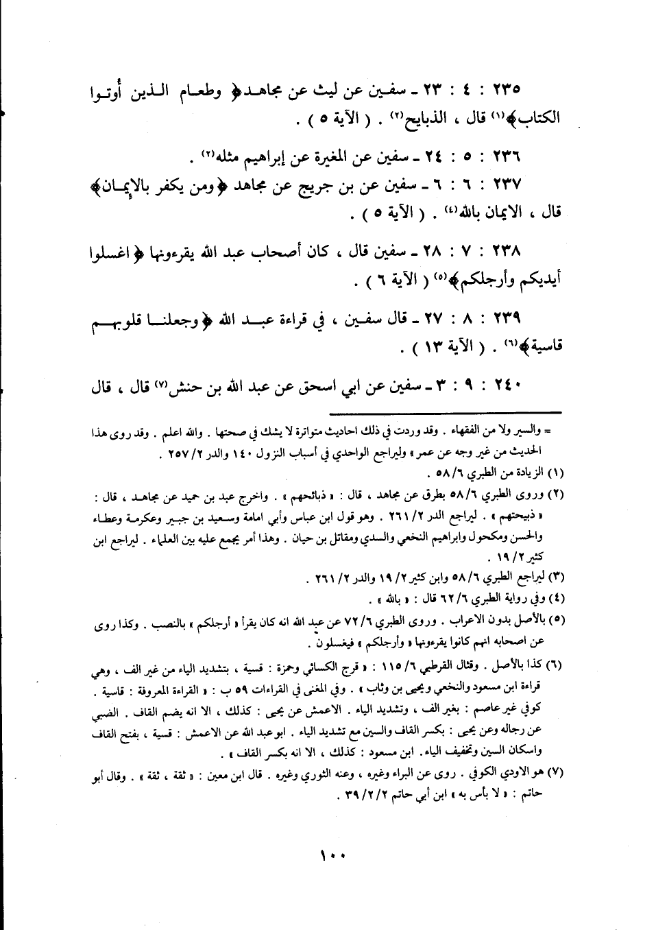 238: 7: 28 سفيان قَالَ كَانَ أَصْحَابُ عَبْدِ اللَّهِ يقرءونها اغسلوا أيديكم وأرجلكم (الآية 6) .