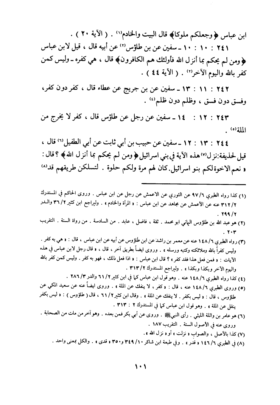 241: 10: 10 سفيان عن بن طاؤس عَنْ أَبِيهِ قَالَ قِيلَ لِابْنِ عَبَّاسٍ وَمَنْ لَمْ يَحْكُمْ بِمَا أَنْزَلَ اللَّهُ فَأُولَئِكَ هُمُ الْكَافِرُونَ قَالَ هِيَ كِفْرَةٌ وَلَيْسَ كَمَنْ كفر بالله واليوم الآخر (الآية 44) .