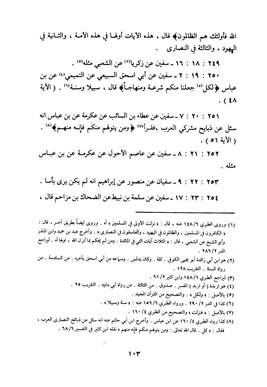 249: 18: 16 سفيان عَنْ زَكَرِيَّا عَنِ الشَّعْبِيِّ مِثْلِهِ 250: 19: 2 سفيان عن أبي اسحق السبيعي عن التميمي عن بن عَبَّاسٍ لِكُلٍّ جَعَلْنَا مِنْكُمْ شِرْعَةً ومنهاجا قال سبيلا وسنة (الآية 48) .